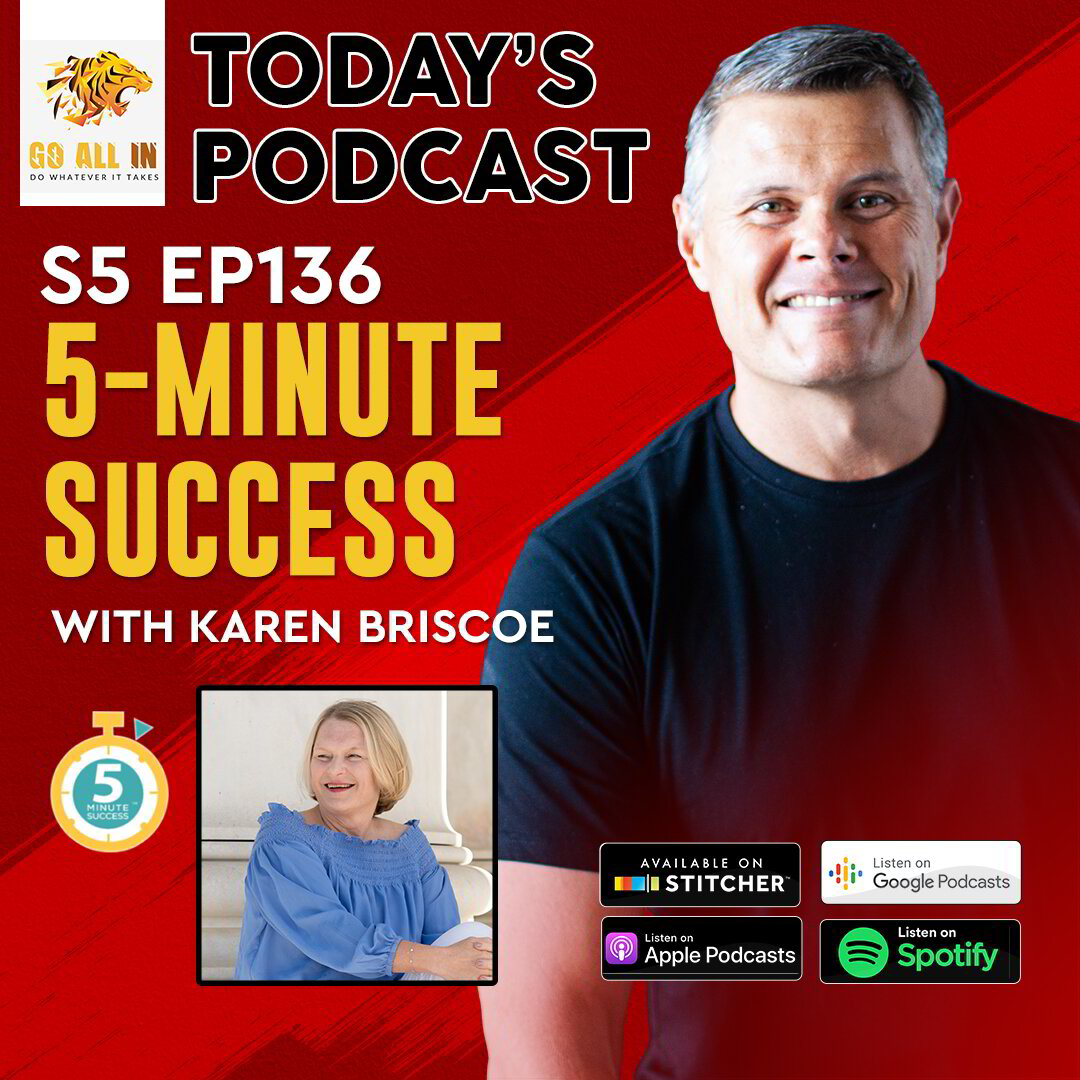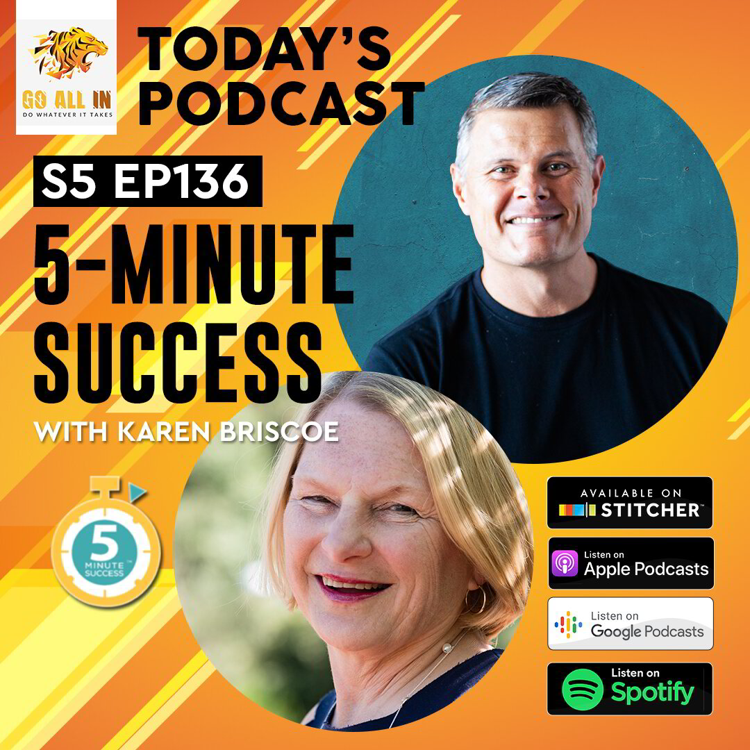 Today on the #goallin podcast we have Karen Briscoe. Karen is the creator of the 5 Minute Success concept. She regularly speaks on a national and local level on the best of 5 Minute Success.