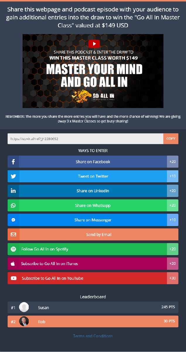 At the bottom of the page we create a campaign that gives the viewer an incentive to share the webpage and the episode i.e. we give away 3 x master classes each worth $149 USD. This gives the user the incentive to share the podcast and widens our reach.